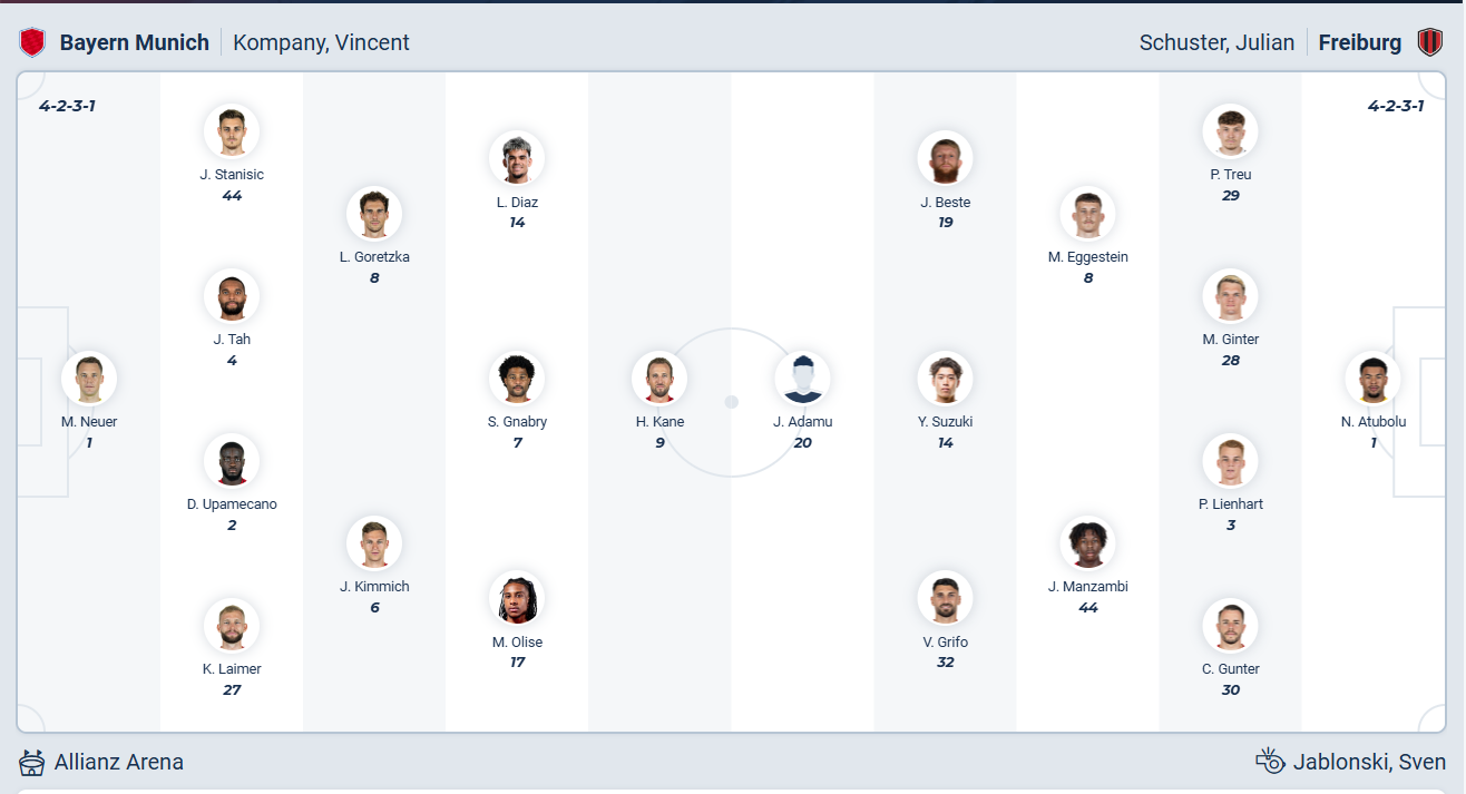 Bayern đã đứt mạch toàn thắng ở vòng đấu trước khi để Union Berlin cầm hòa 2-2, đương nhiên đó là kết quả không như ý và các cầu thủ của HLV Vincent Kompany cần ngay lập tức trở lại với mạch chiến thắng để tiếp tục giữ khoảng cách an toàn với nhóm bám đuổi. Freiburg không phải đội bóng mạnh, họ có thực lực thua kém Bayern nhiều nhưng phong độ rất ổn thời gian gần đây của họ sẽ khiến Bayern gặp nhiều khó khăn, nhiều khả năng đội bóng chủ nhà sẽ chỉ giành chiến thắng với cách biệt 1 bàn.