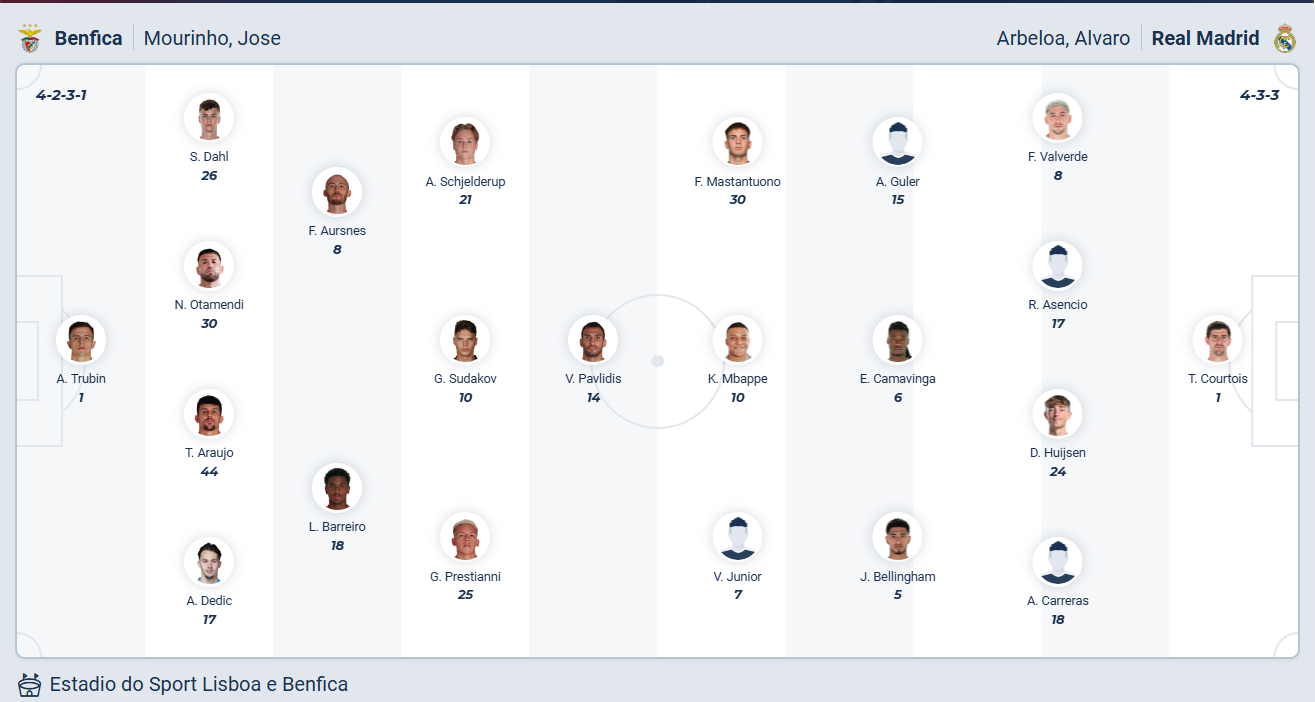 Real Madrid đang có 15 điểm sau 7 lượt đấu cùng vị trí thứ 3 trên bảng xếp hạng, vị trí không đến nỗi tệ dù họ đã có những trận thua rất đáng thất vọng. Đội bóng của HLV Alvero Arbeloa có rất nhiều cơ hội để nằm trong top 8 đội dẫn đầu, họ cần thắng để chắc chắn đạt được mục đích nhưng 1 trận hòa có khi cũng là đủ. Dù vậy chắc chắn các cầu thủ Real Madrid vẫn sẽ quyết tâm giành chiến thắng để khẳng định sức mạnh của mình khi vẫn có nhiều nghi ngờ về lối đá của họ. Chính vì vậy nhiều khả năng Real Madrid sẽ chơi đúng với khả năng và thắng Benfica ở lượt đấu cuối cùng vòng League Phase.